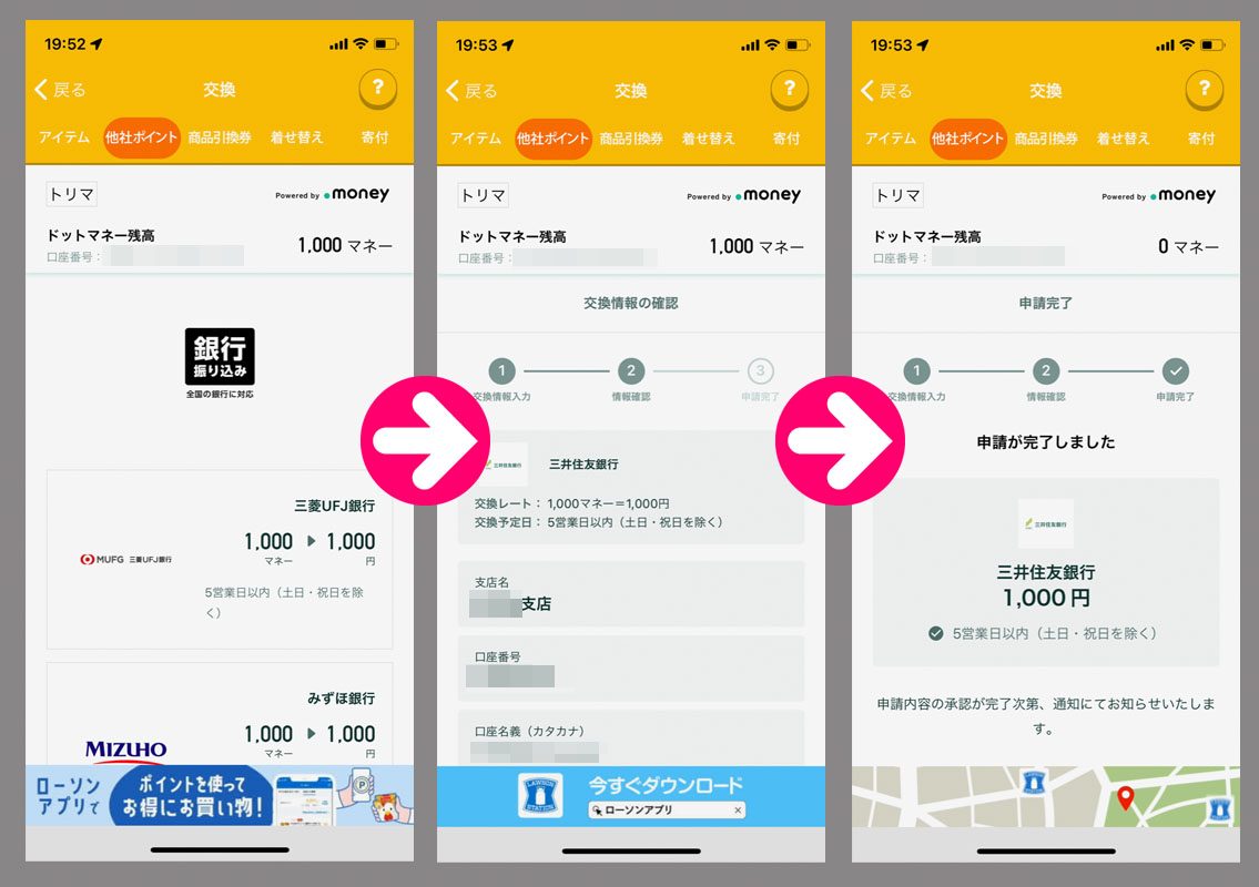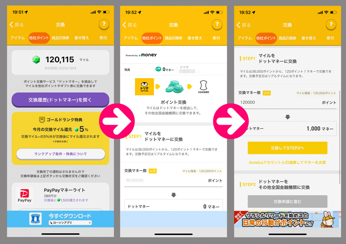 トリマで貯めたマイルをドットマネーに変換からの換金へ|2025.5.8 トリマのマイルが120,000になったのでドットマネーに変換からの換金。 前回が4月10日でしたので今回は1ヵ月経たず換金です。 (詳しい換金手順はこちらをご覧ください) まずはマイルをドットマネーに・・・。 そしてアプリ内でドットマネーを現金に・・・。 今が木曜日の夜なので三井住友銀行口座に入るのは週明けかも? トリマなので「iFreeレバレッジFANG+」へ入れる予定です。