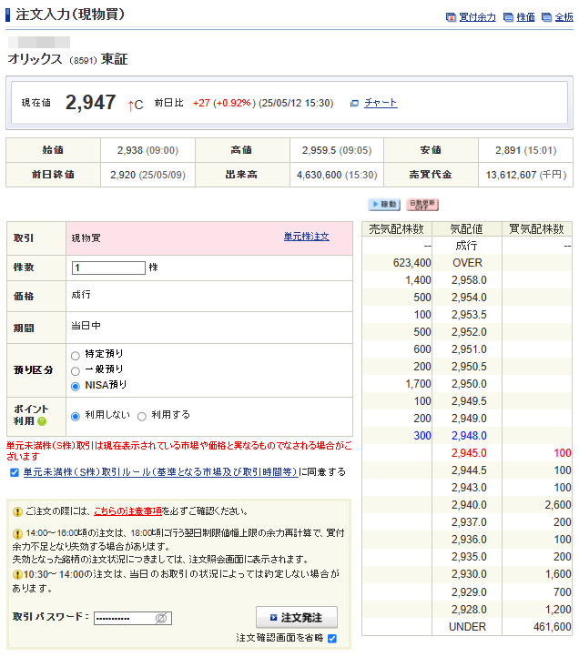 私のNISA口座のオリックスはまだまだ含み損幅が大きいので平均は下げられると思うのですが。