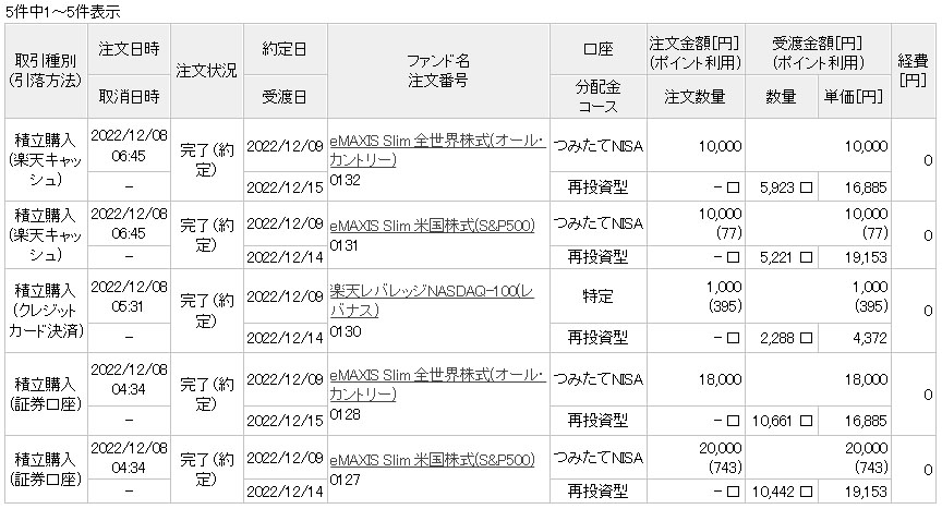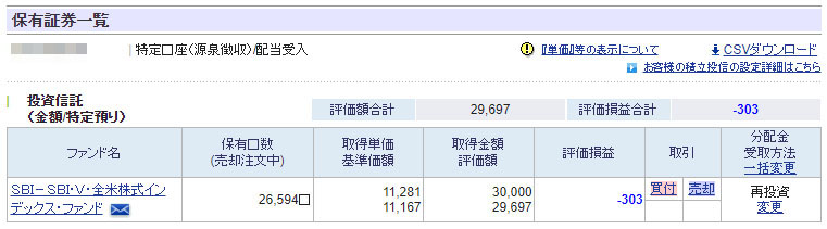 SBI証券は相変わらず「SBI・V・全米株式インデックスファンド」の定期積立とスポットのみ
