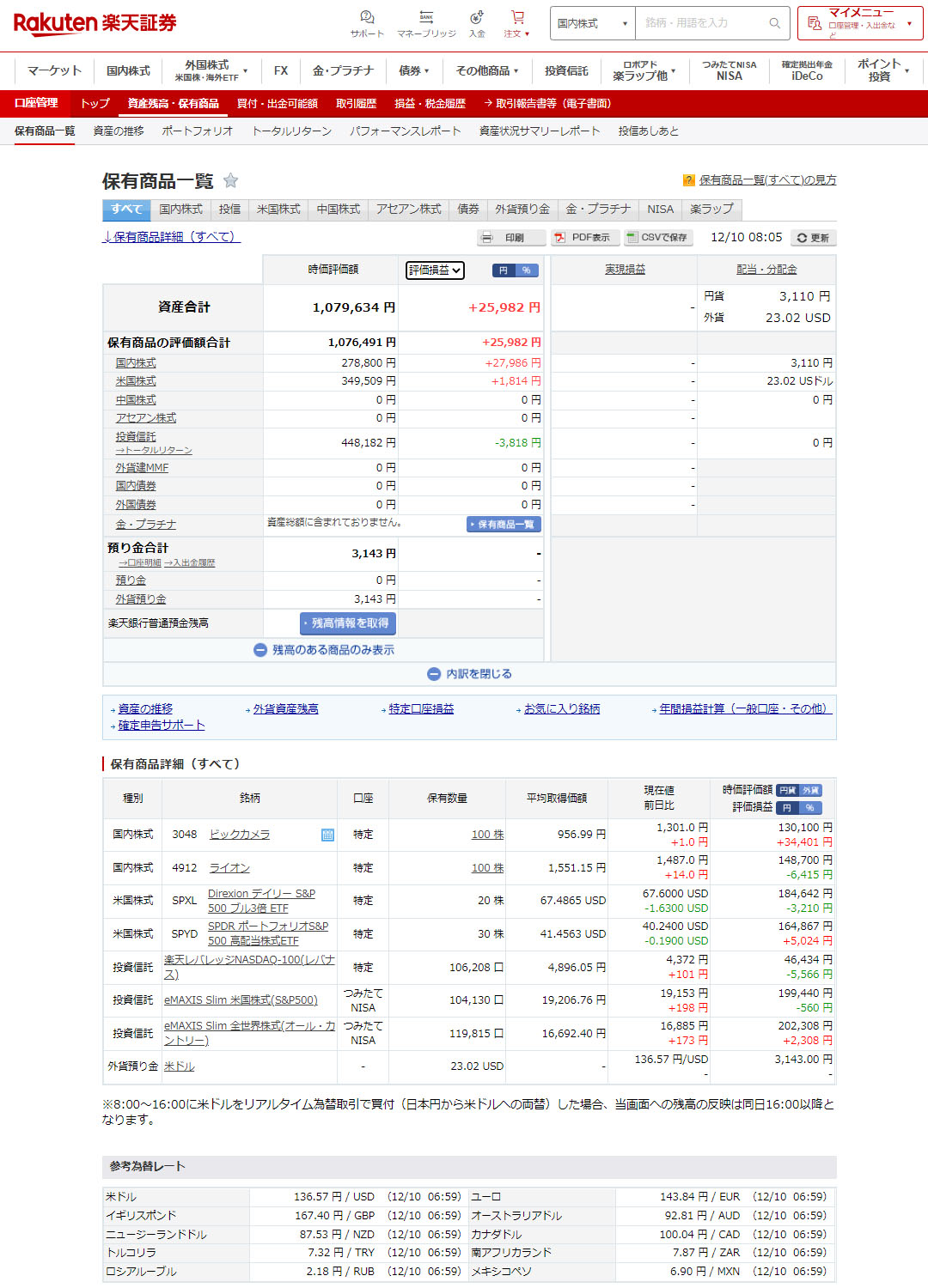 米国市況は相変わらずの軟調ですが日本株がやや上がっています。基本は米国投資なので資産は目減り。トータルではビックカメラの含み益のおかげで25,982円の評価益で踏みとどまっています。