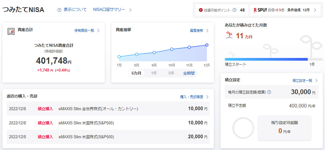 「つみたてNISA」は11ヵ月を経過。年度枠の40万円は使い切っていますので実質12ヵ月ではあります。