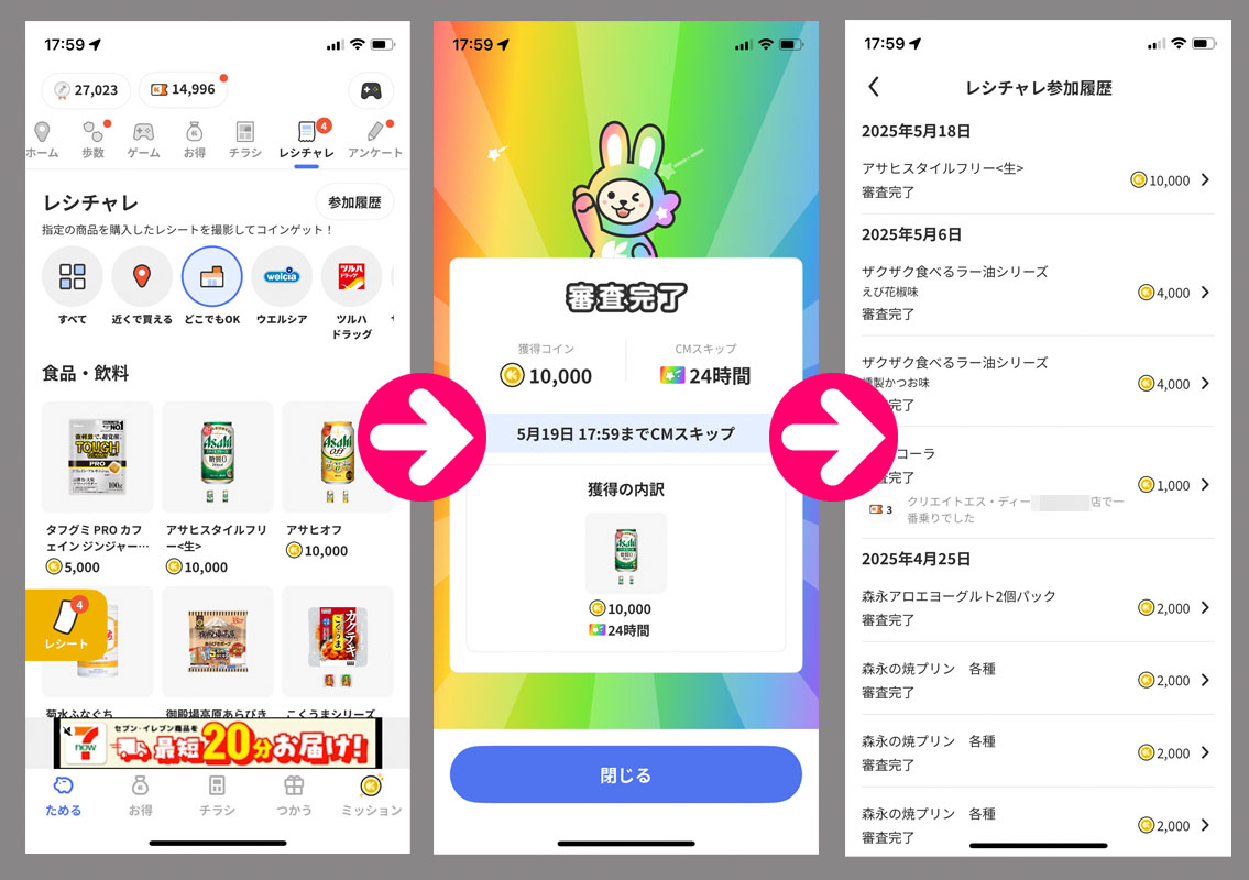 こちらも即時審査で「完了」コイン10,000と24時間CMスキップになりました。