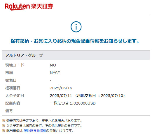 アルトリア・グループ(MO)配当予告 2025.7月分 楽天証券から「アルトリア・グループ」の配当予告メールが届きました。 この分から7株になります。 ========(以下、コピペw)======== $1.02×7株=$7.14 $7.14×0.9=$6.426 $6.426×0.8≒$5.1408 ・・・多分、$5.14かな? ===========================
