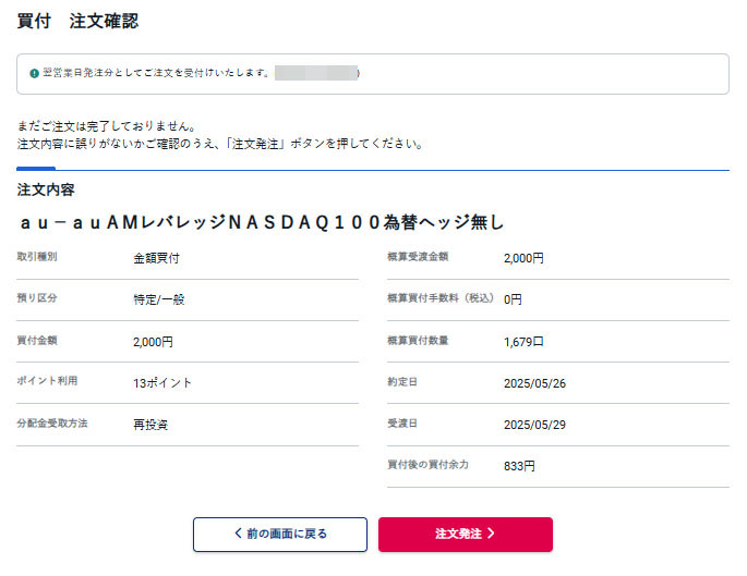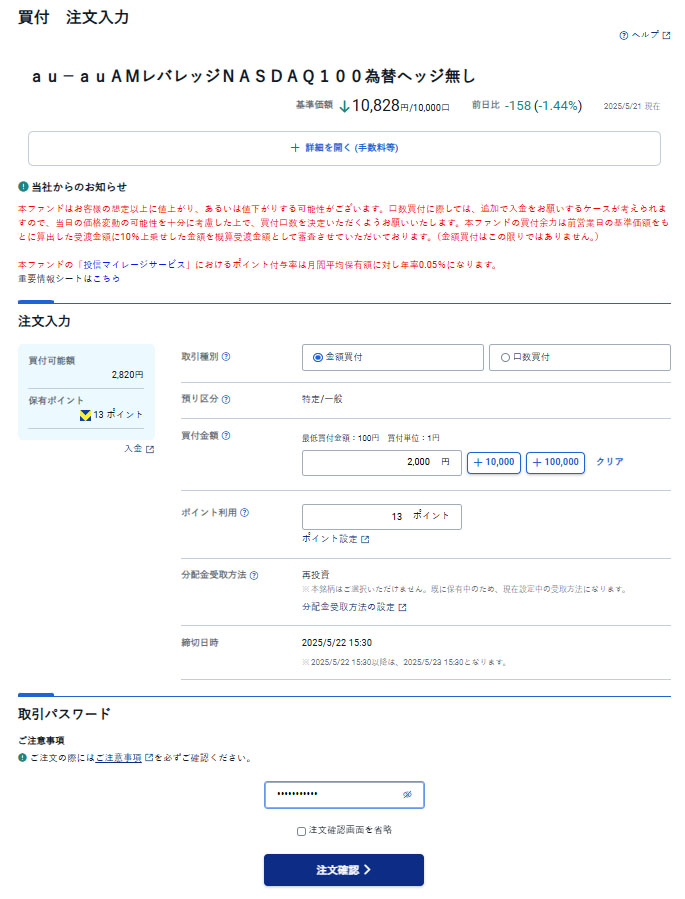 ですので「auAMレバレッジNASDAQ100為替ヘッジ無し」に2,000円となります。