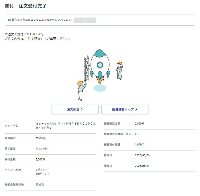 Vポイントが入ったので「auAMレバレッジNASDAQ100為替ヘッジ無し」に2,000円追加投入します。