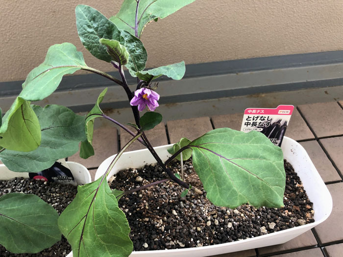 園芸野菜2025|ナス② 4月27日に植えた「なす」に花が咲きました。 こちらは「とげなし中長なす」です。 一応は順調なのかな?まぁ去年も花は咲いたのですが。。。 今年は水やりを慎重にしています。葉が萎れてきたらたっぷりと・・・。