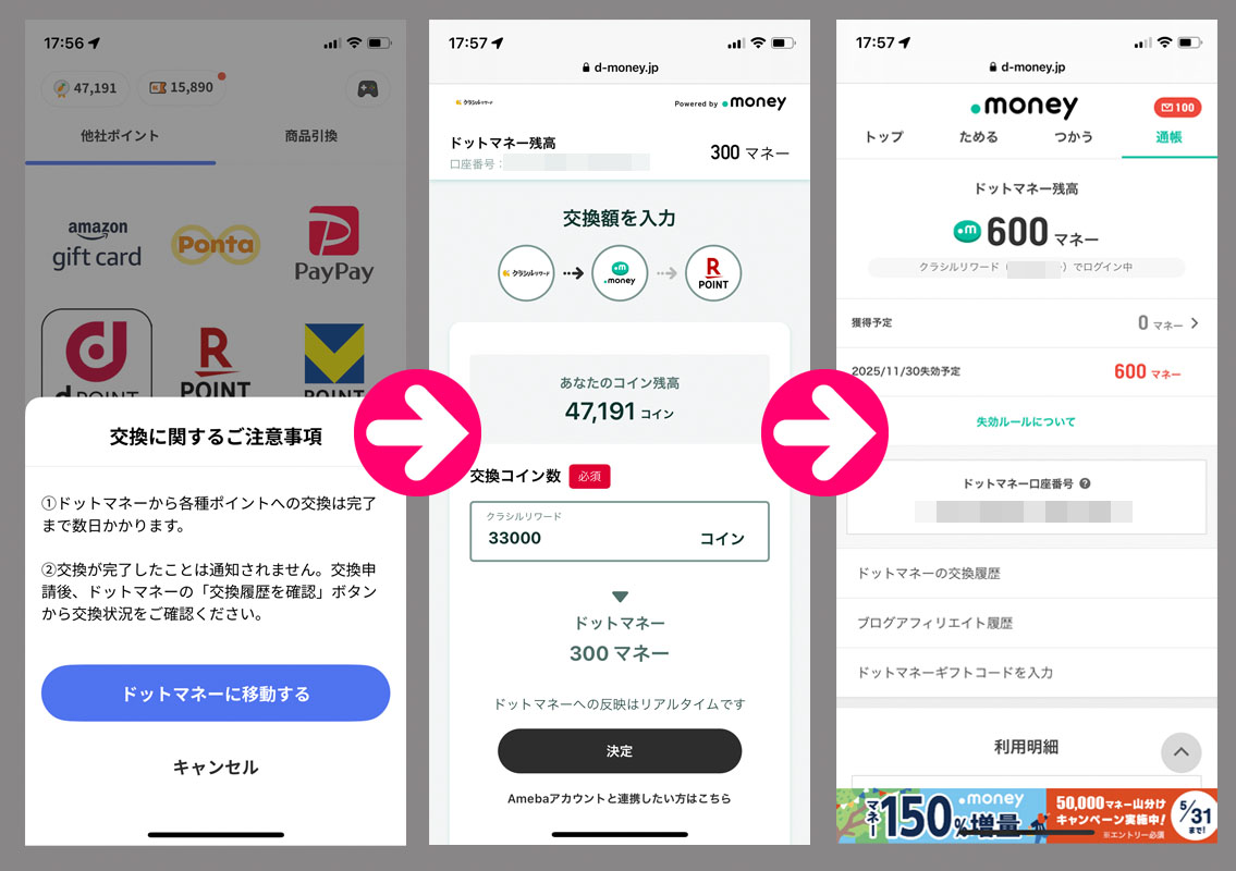 クラシルリワードのコインが貯まったのでドットマネーに変換|2025.5.25 昨日のレシチャレでコインが33,000になったのでドットマネーに交換します。 (詳しい変換方法と換金方法はこちらをご覧ください) これで換金に必要なドットマネーはあと400ですがクラシルリワードは300刻みなので33,000コインをあと2回分となります。