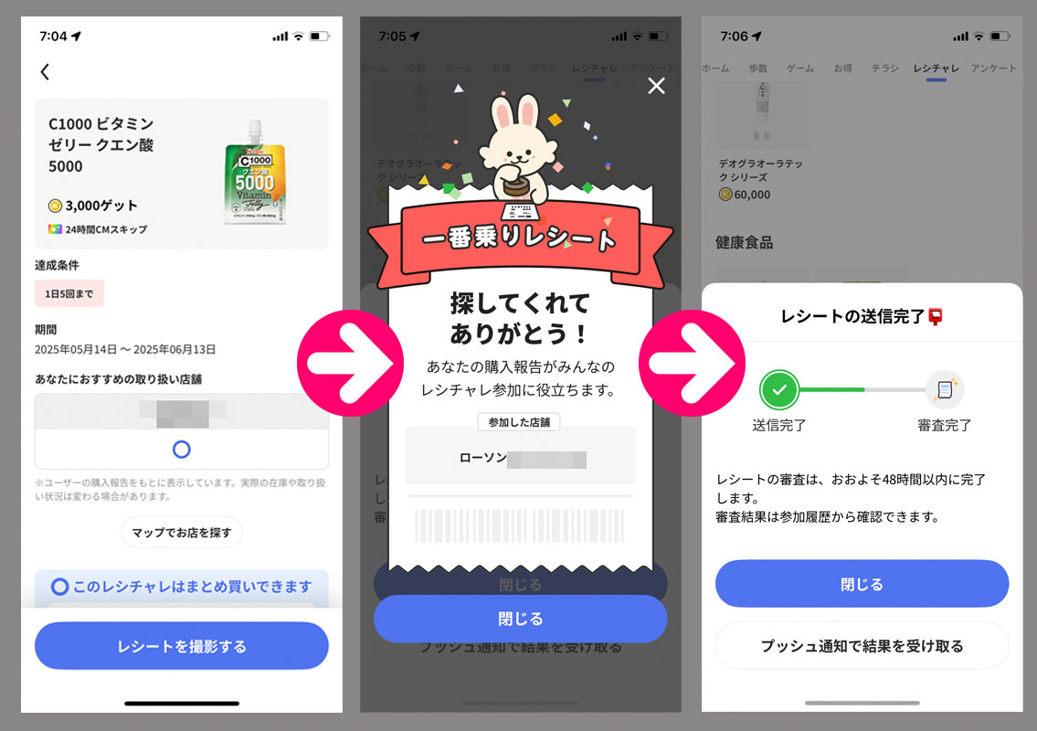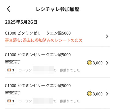 クラシルリワードのレシチャレ90 ・・・もうレシチャレも90回もやってるのか。 今日もシルバー会員目指して「C1000ビタミンゼリー クエン酸5000」を購入。 2個いっぺんに買ってレシートは1枚です。 そして何時ものように・・・。 別々に応募したのですがまた進化したようで1枚のレシートに2個だと勝手に認識するみたいで、2回目は「審査落ち」となりました。よく確認しないとですねw こちらはコイン3,000×2個分とCMスキップ24時間×2です。