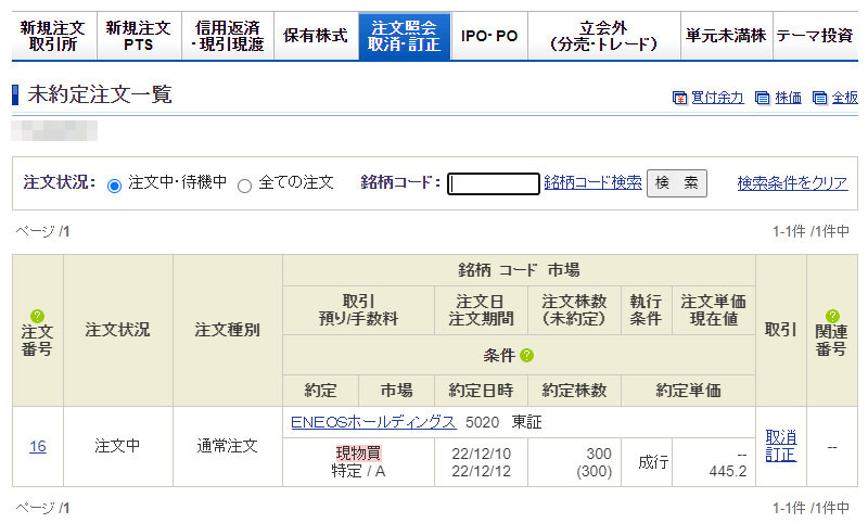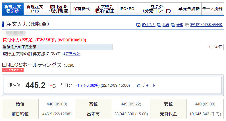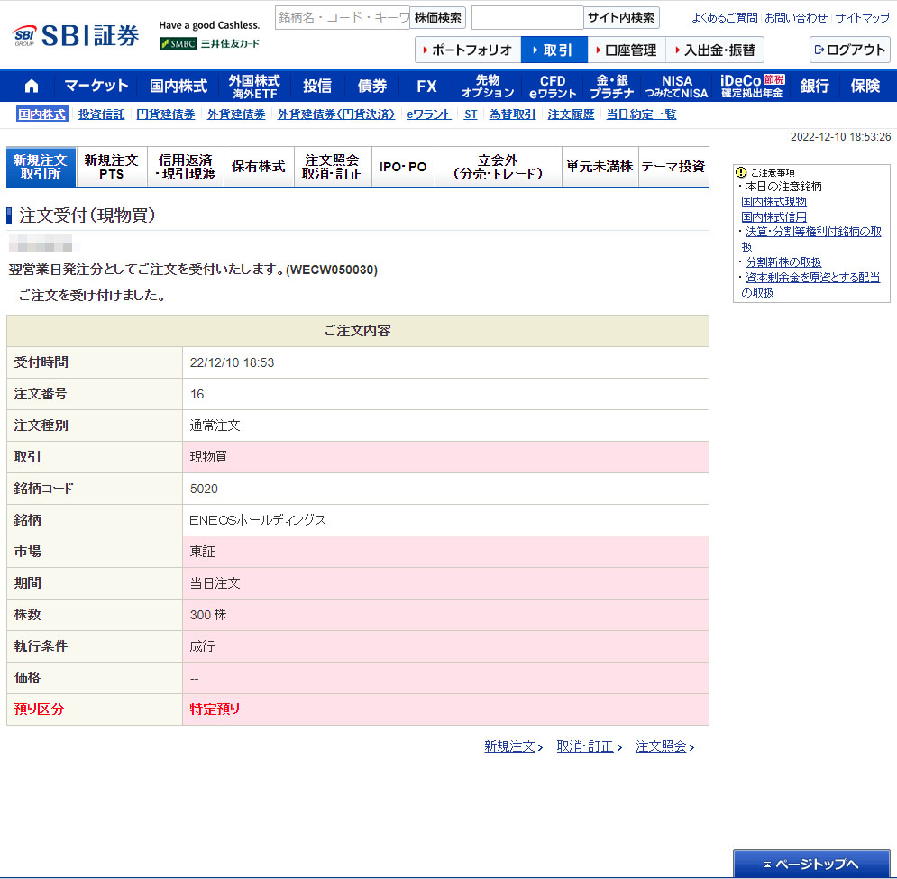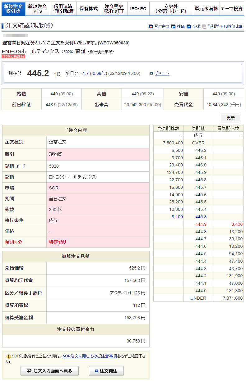 ENEOSホールディングス(5020) コメントを残す もう買う事もないだろう・・・と思っていた日本の個別銘柄を買う事にしました。 「ENEOSホールディングス」です。 週末の終値は445.2円。100株で44,520円になる計算 300株で買い注文を入れます。 135,000円を楽天銀行から資金移動したのですが余力不足とされ。。。追加で50,000円 今度は注文受付しました。 受付完了 成行なので12月12日には約定すると思います。 あ~~~ボーナスも出ないのに年末にとんだ大出費ですw
