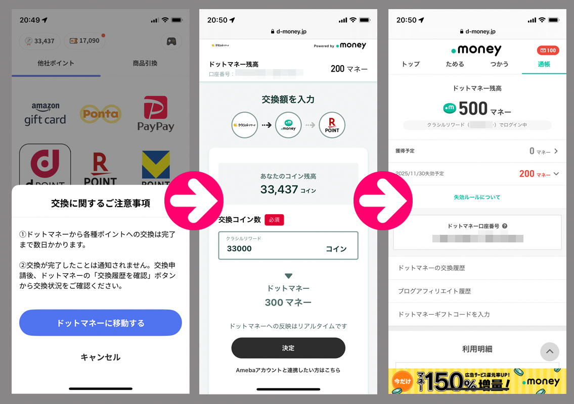 クラシルリワードのコインが貯まったのでドットマネーに変換|2025.6.5 クラシルリワードのコインが33,000になったのでドットマネーに交換します。 (詳しい変換方法と換金方法はこちらをご覧ください) 前回の残が200ありますのでこれで500ドットマネー。 あと2回の33,000コインで換金となります。