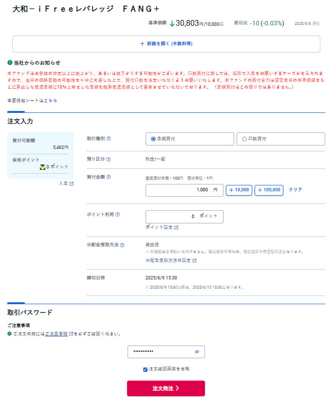 歩いて稼いだ資金を「iFreeレバレッジFANG+」へ|2025.6.9 申請していた「トリマ」分のドットマネーが換金されましたので「iFreeレバレッジFANG+」へ入金します。 三井住友銀行口座にCYBERAGENTから1,000円の入金。 それをそのまま・・・ 今回、買付時に目論見書の確認がありました。 これ読んで「もうやめた!」って人居るのでしょうか? レバなので特定口座です。 ロケット発射! 約定は6月11日(水曜日)です。 FANG+はトランプ関税ショックから立ち直りも良く足元では好調!テスラが外れてるのが大きいですね~w