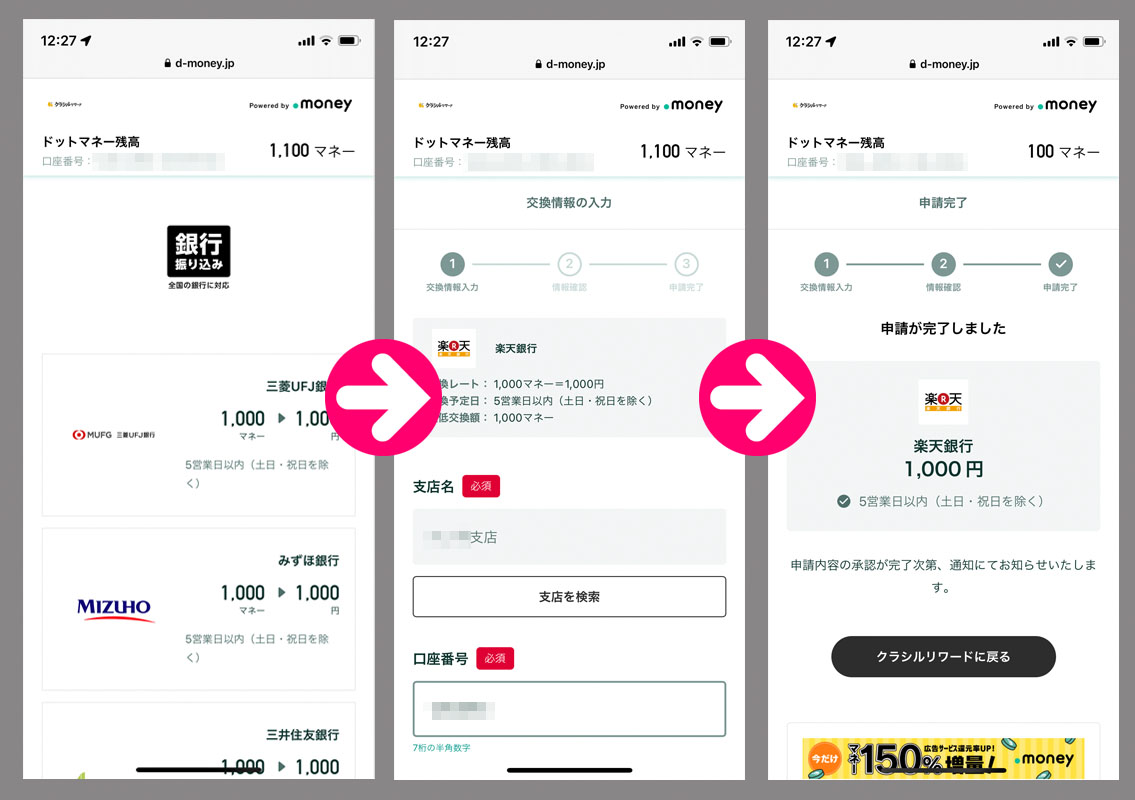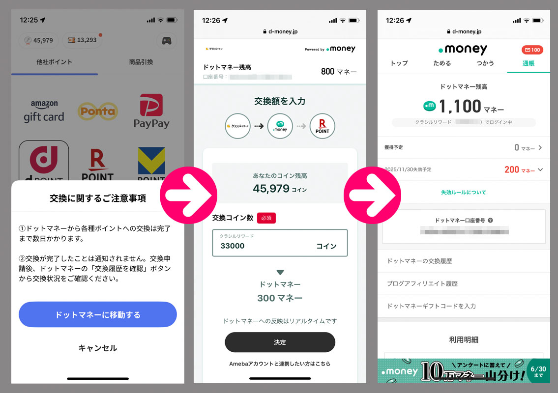 クラシルリワードのコインが貯まったのでドットマネーに変換からの換金手続き|2025.6.12 レシチャレで30,000コインが入ったので当然33,000コインはオーバーなのでドットマネーに変換。そしてこれで1,100ドットマネーになるので換金手続きまで。 (詳しい変換方法と換金方法はこちらをご覧ください) クラシルリワードは楽天銀行口座に紐づいています。今日が木曜日なので週明けの月曜日か火曜日の入金だと思います。こちらはいつも通り「ニッセイNASDAQ100インデックスファンド」へ入れる予定です。
