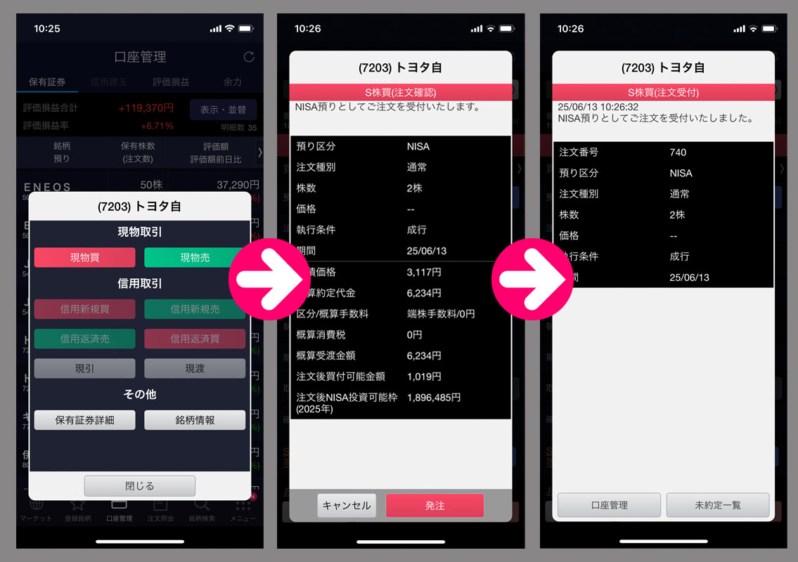 まだ10:30前でしたので後場寄り向けでの株価で約定です。