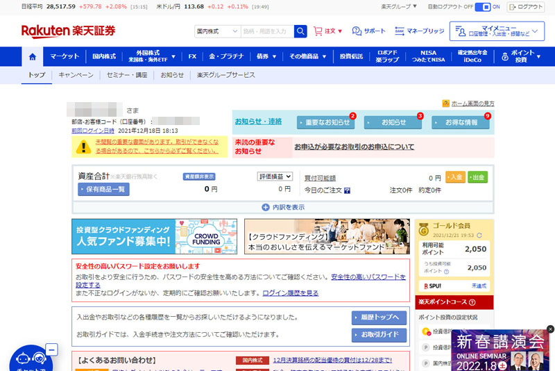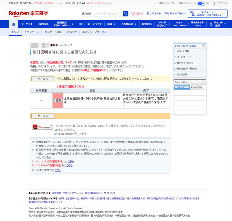 すると「未閲覧の重要な書類があります。取引ができなる場合があるので、こちらから必ずご覧ください」の注意書きが出ていました。