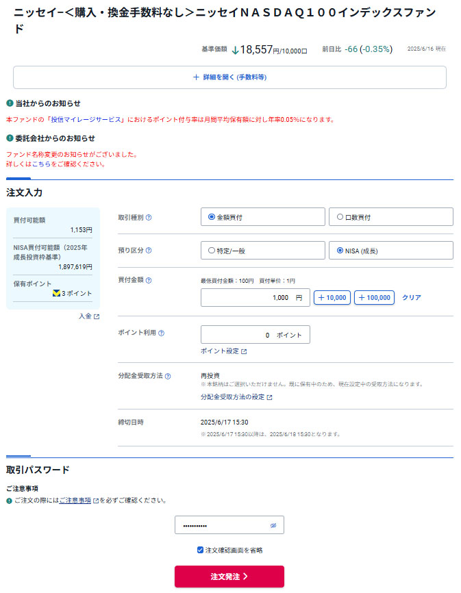 申請していた「Powl」ポイント分のドットマネーが換金されたので「ニッセイNASDAQ100インデックスファンド」へそのまま1,000円入れます。