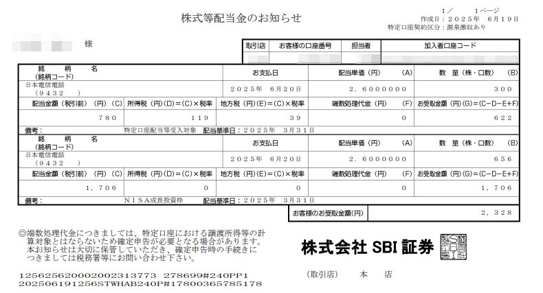 7月からNTTに社名が変わる「日本電信電話」からこの社名で最後の配当が入りました。