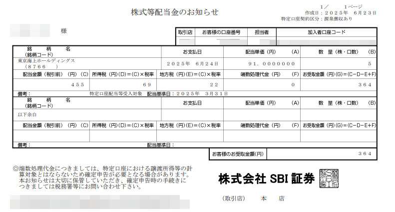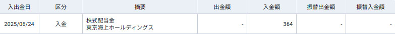 これを書いている時点では未来の事ですが・・・。 東京海上ホールディングスから週明けの火曜日の6月24日に配当が入るようです。