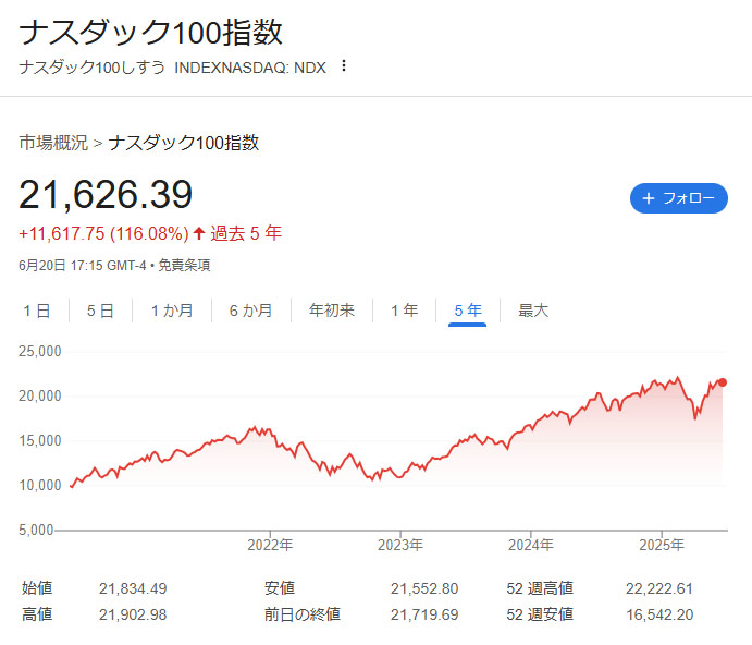 インデックスと言っても色々ありますが今回は代表的な「S&P500指数」と「NASDAQ100指数」で考えてみます。直近5年で比べてみました。