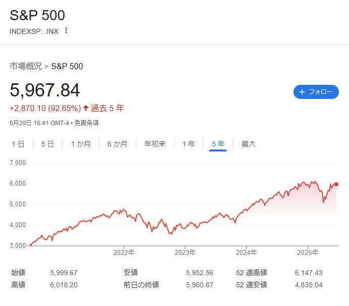 配当金はありませんが再投資設定が通常だと思いますのでもしかしたら160%位かもしれません。長期になればなるほど利回りは良くなっていきます。ただし今後も米国経済が成長を続けるとしてです。個人的には成長は続けますが伸び率は年々鈍化すると思っています。