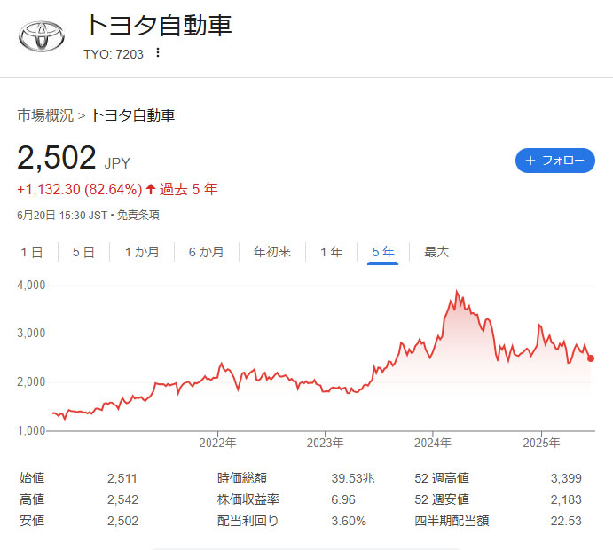 では高配当とはいいがたいけど好配当的な利回りのトヨタは?