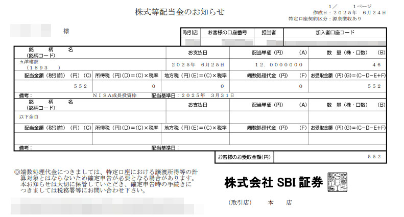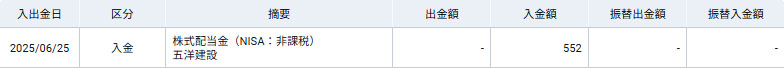 明日の6月25日に「機種変代わりに~」企画でスマホを機種変する代わりにその分のお金で少しづつ買っている「五洋建設」から2回目の配当が入るようです。