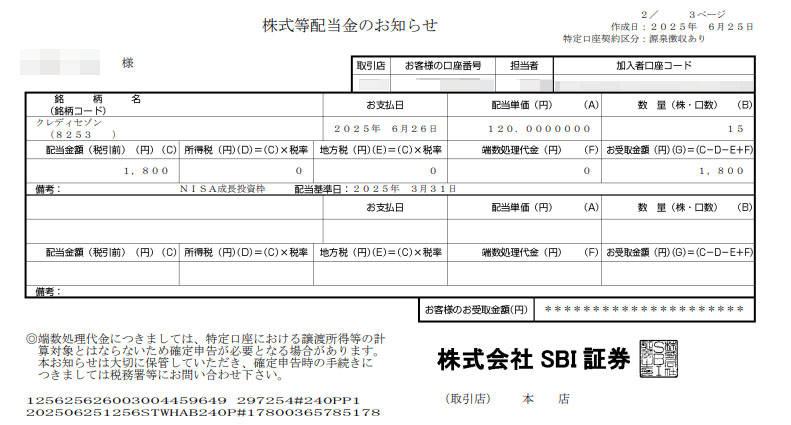 2年前に貯まりに貯まった「永久不滅ポイント」を現金化して買った「クレディセゾン」から2回目の配当が入りました。クレディセゾンは年1回の配当です。