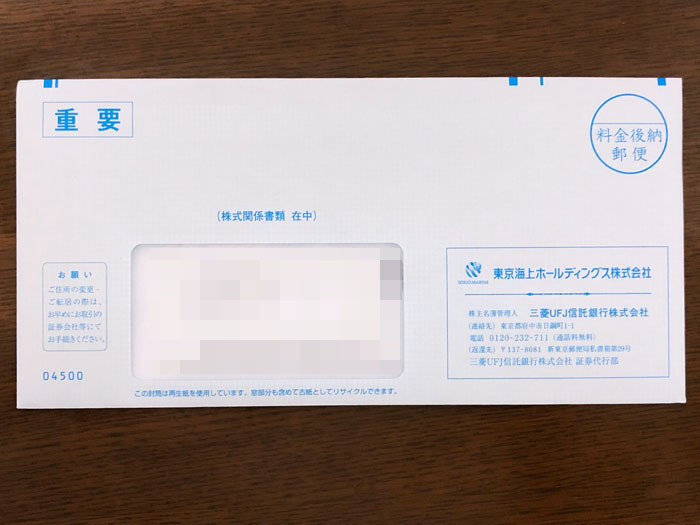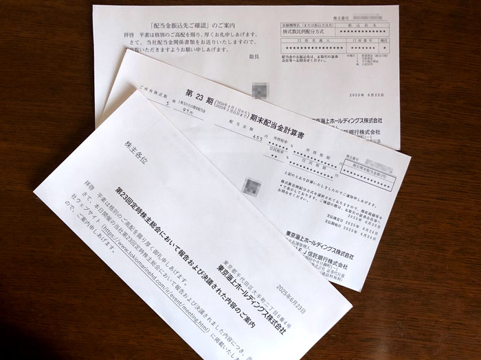 東京海上ホールディングス(8766)から株式関係書類が届きました|2025.6.26 6月24日に配当が出た「東京海上ホールディングス」から株式関係書類が届きました。 窓付き洋0封筒 特1 中身は「配当金振込先ご確認 のご案内」「第23期 期末配当金計算書」「第23回定時株主総会において報告および決議された内容のご案内」の3枚。どれもシンプルに墨イチ印刷 「第23回定時株主総会において報告および決議された内容のご案内」はWEBでも公開されているようです。 私は議決権がないので結果だけの参照になります。