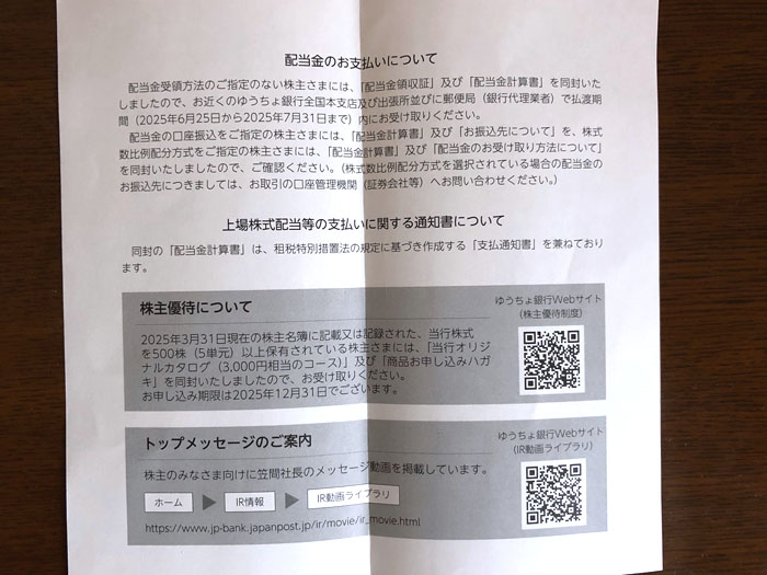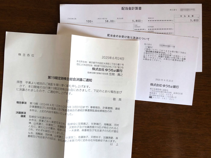 ゆうちょ銀行(7182)から株式関係書類が届きました|2025.6.26 「ゆうちょ銀行」から “株式関係書類” が届きました。 窓付き洋0封筒 2色 内容は「配当金計算書」「配当金のお受け取り方法について」「第19期定時株主総会決議ご通知」の3枚です。 ゆうちょ銀行は単元ありますので議決権を持っていますが今回は行使せずでした。 ゆうちょ銀行の株主優待は結構魅力的なのですが500株となると・・・年に100株でも5年掛かりますね~ 私の場合は100あるので4年。利回りが良いので500持ってもイイかな~とは思っていますが資金が・・・涙