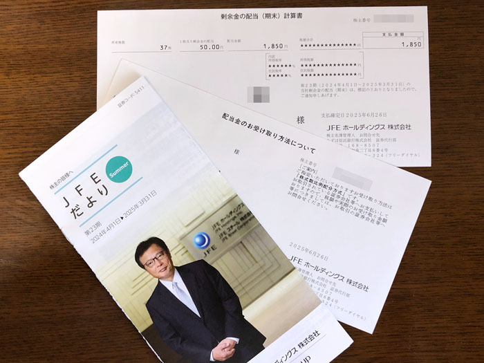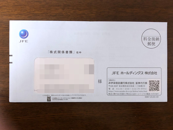 日本株の「高配当株15(+1)銘柄」で買い進めている「JFEホールディングス」から株式関係書類が届きました。