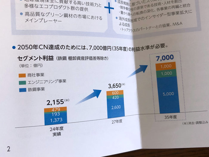 CNとはカーボンニュートラル。セグメントの割合は当たり前ですが「鉄鋼事業」がかなりの割合を占めている。このCNって利益に繋がるのかな~と何時も思っています。かなり長期的な感じがするけど35年度の目標が24年度の約4倍・・・達成可能なのか???