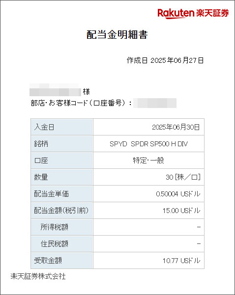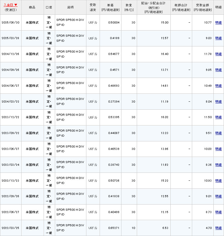 米国高配当ETFのSPYDから3ヶ月に1回の配当が入りました。