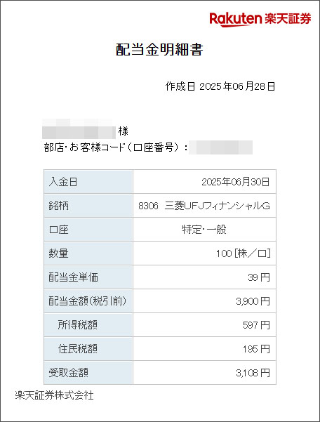 三菱UFJフィナンシャルグループ(8306)の配当が入りました|2025.6.30 こちらは「楽天証券」で保有の特定口座100株分です。 配当は39円。去年より・・・えっ!18.5円も増配してますがw 何かの間違え?と思うぐらいwww もう高配当投資なんてメガバンだけでも良さそうに思えてくるw