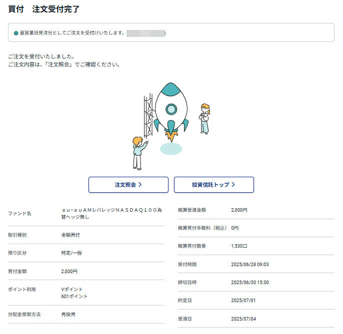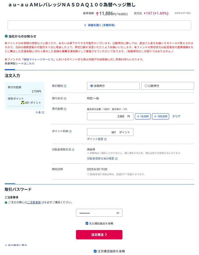 約定は6月30日の基準価格(多分)で7月1日(火曜日)となります。