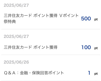 「三井住友カード ポイント獲得 Vポイント祭特典」分500ポイントと「三井住友カード ポイント獲得」分の100ポイント、Vポイント「Q&Aメール」の1ポイントで計601ポイントです。