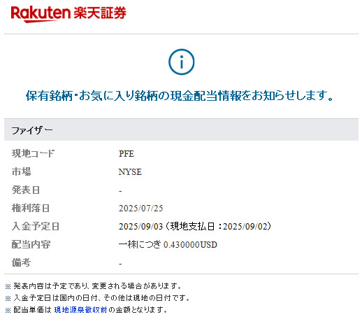 ファイザー(PFE)配当予告 2025.9月分|2025.6.30 「米国高配当株8銘柄」で少しづつ買ってる「ファイザー(PFE)」の9月分配当の案内メールが楽天証券から届きました。もう9月ですってw ファイザーは10株の保有です。 ========(以下、コピペw)======== $0.43×10株=$4.30 $4.30×0.9=$3.87 $3.87×0.8≒3.096 で前回は$3.09でした。 ===========================