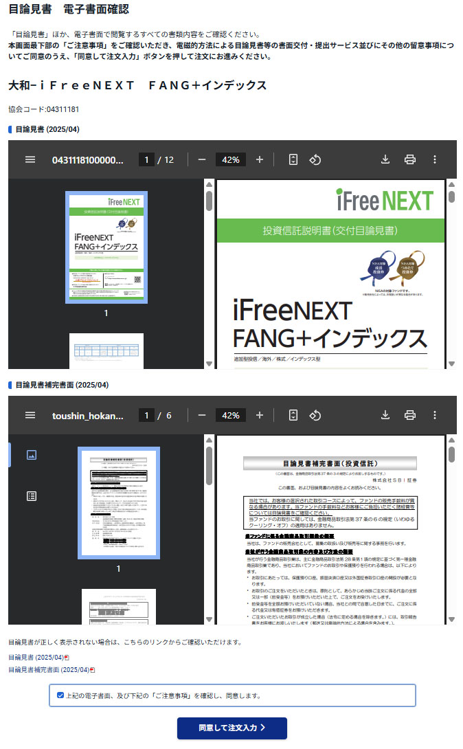 やはり初めてなので目論見書の閲覧が義務になります。「同意して注文入力」