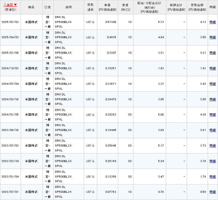 SPXLの分配金が入りました|2025.7.2 米国のS&P500指数3倍ブルの「SPXL」から分配金が入りました。 こちらもおなじみの年4回の配当になります。 10株の保有です。 今回は$0.57303 前回が$0.4935 前年同期が$0.33671 でしたので結構高かったようです。 過去を振り返っても2022年7月の$0.0763に次ぐ高さ・・・。 SPXLはもちろんキャピタル狙いなので分配金はおまけのようなものですが四半期に定期的に入るし600円程度と少ないですがお小遣いにwww