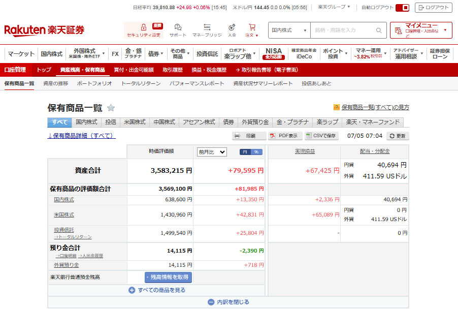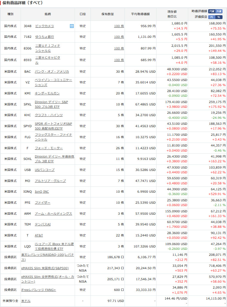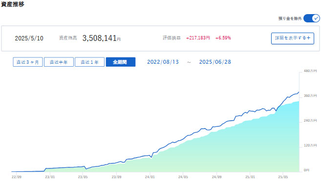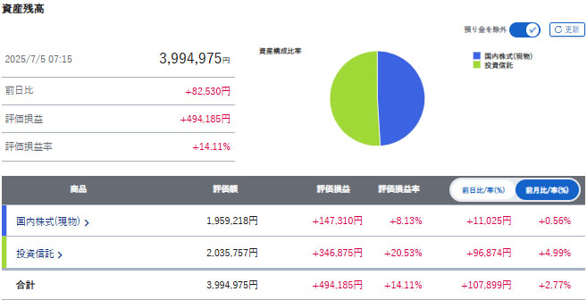 7月に入り米国株高が続き資産は一気に増えました。まだ関税問題が殆ど解決していないのに利下げ期待から市場はリスクオンムードです。これから夏枯れシーズンとともにFOMCやジャクソンホールでのパウエルさんの発言で大きく下げるかも?と考えています。