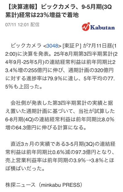 ビックカメラ第3四半期決算|2025.7.11 今日、株価が大幅下落したビックカメラ。 5.5%の下落で-95.0 円でした。 引け後に決算だったのですが 内容は悪くなく・・・というか良くて 決算発表前から下げ続けてたので何か情報がリークされてたのか?それとも決算跨ぎで売られたのか?何れにしても今の株価が天井とみられ売りが殺到したか? またはインバウンドが頭打ちと捉えられてのか? 私は優待目当てで保有してるのでマイテンしなければ全然OKですのでwww