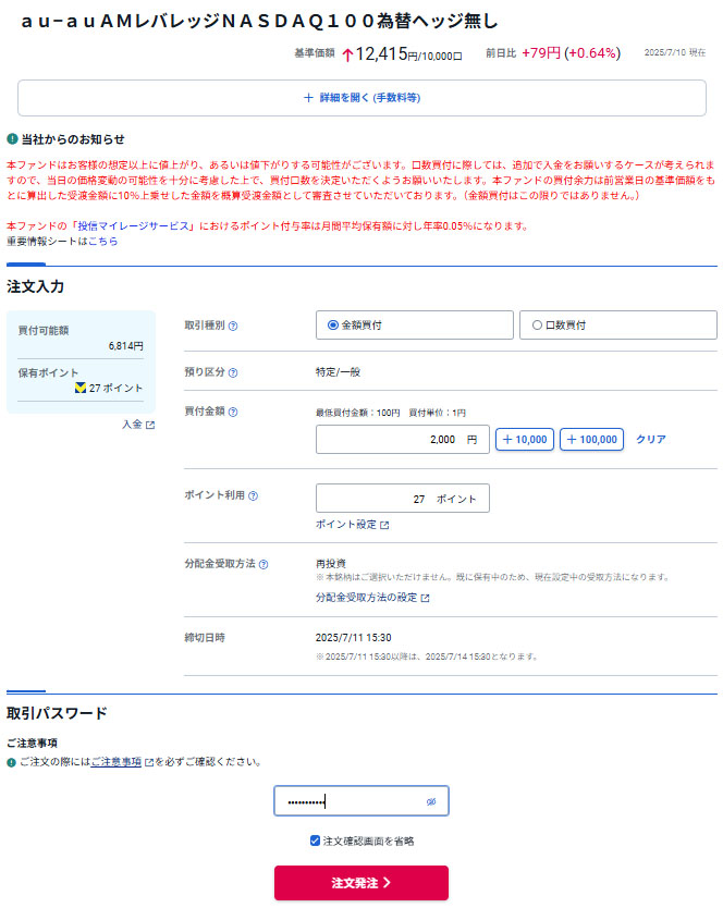 Vポイントが入ったのでauAMレバレッジNASDAQ100為替ヘッジ無しを2,000円分追加|2025.7.11 Vポイントが入ったので「auAMレバレッジNASDAQ100為替ヘッジ無し」へ追加します。 今回入ったポイントは 「三井住友カード コンビニ・飲食店_カードのタッチ 三井住友VISA(NL)」分の26ポイントとVポイント「Q&Aメール」の1ポイントで合計27ポイントです。 為替は・・・ やや円高ですが相変わらずの円安傾向で146.91・・・なので「為替ヘッジなし」に2,000円分です。 ポイントはすべて利用で現金は1,973円の出金 ロケット発射! 約定は週明け火曜日の7月15日です。