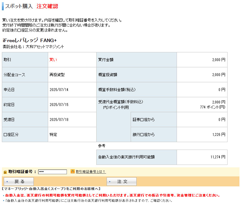 この「FANG+インデックス」vs「レバレッジFANG+」は同日同額を入れることにしていますので「iFree レバレッジ FANG+」にも同額の2,000円分を入れます。