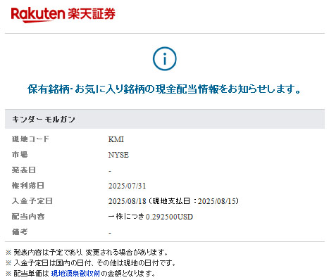 キンダー・モルガン(KMI)配当予告 2025 8月分 米国の高配当銘柄「キンダー・モルガン」の配当予告メールが楽天証券から届きました。 KMIは現在20株の保有で・・・ ========(以下、コピペw)======== $0.2925×20株=$5.85 $5.85×0.9=$5.265 $5.265×0.8 で前回は$4.20・・・でした。 ===========================