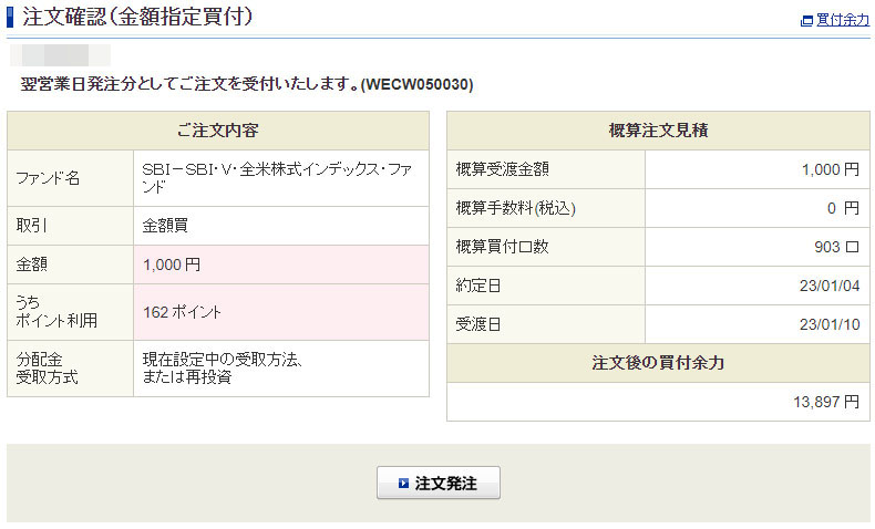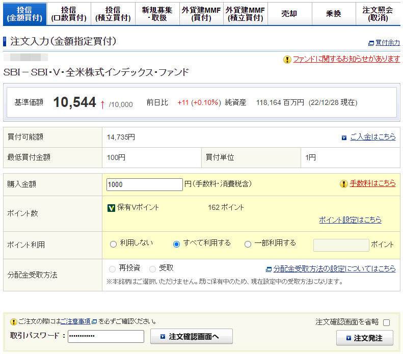 Vポイントが入ったのでSBI・V・全米株式インデックスファンドを1,000円分追加|2022.12.29 コメントを残す 2日続けてVポイントが入ったのでまたまたSBI・V・全米株式インデックスに・・・。 今回はタッチ決済分との事でした。 Vポイントは理解してないのでどのタイミングでポイントが入るか?掴んでいませんが月末に3回入る様です。 毎度毎度の1,000円分でポイントは「すべて利用する」です。 ポイントは162ポイントなので持ち出しは838円となります。 遂に来年の約定となりました。