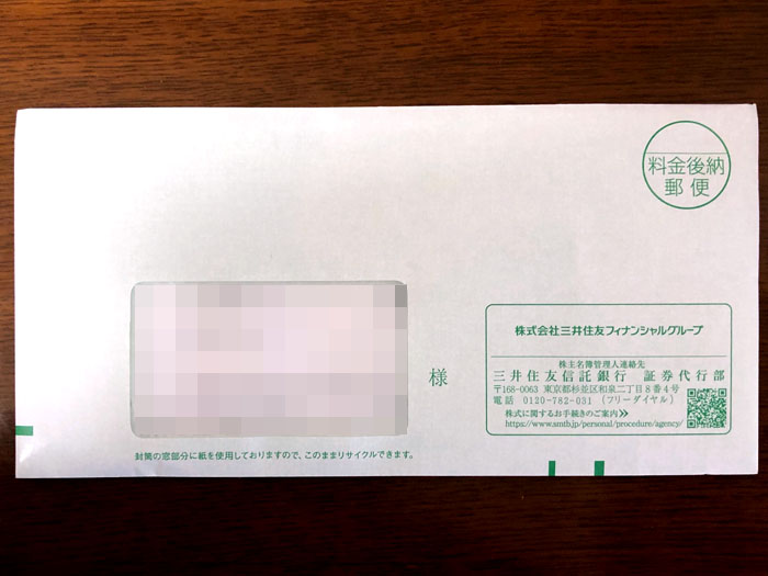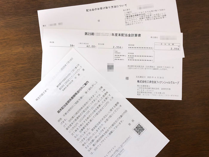 三井住友フィナンシャルグループ(8316)から封書が届きました|2025.7.22 株式書類とは書いてありませんがこの時期に来る封書なんてw 送り主も「三井住友信託銀行 証券代行部」だし・・・。 おなじみのグリーンの印刷の窓付き洋0封筒 中身は3枚 「配当金のお受け取り方法について」「第23期 本年度末配当金計算書」「期末配当金関係書類送付のご案内」 特に読み物的なものは無い極々シンプルなもの。配当金は62円でした。