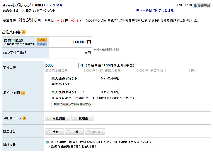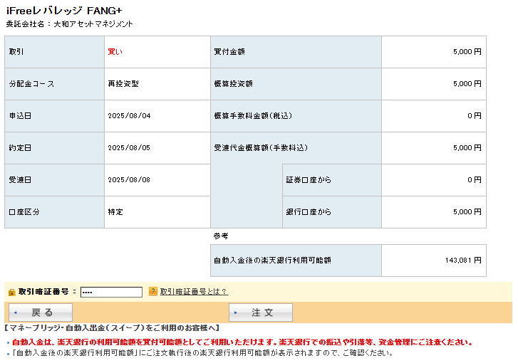 レバレッジの「iFree レバレッジ FANG+」の方へもインデックス同様に5,000円入れます。