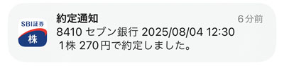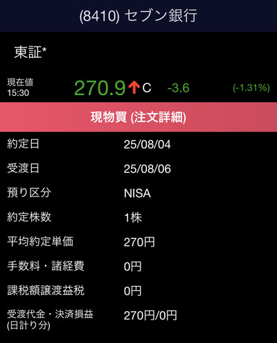 注文時よりやや上がりましたが、先週末の終値からは4円の下げです。「セブン銀行」はもともと下げ相場でしたし今日は他の銀行株も軒並み大きく下げました。
