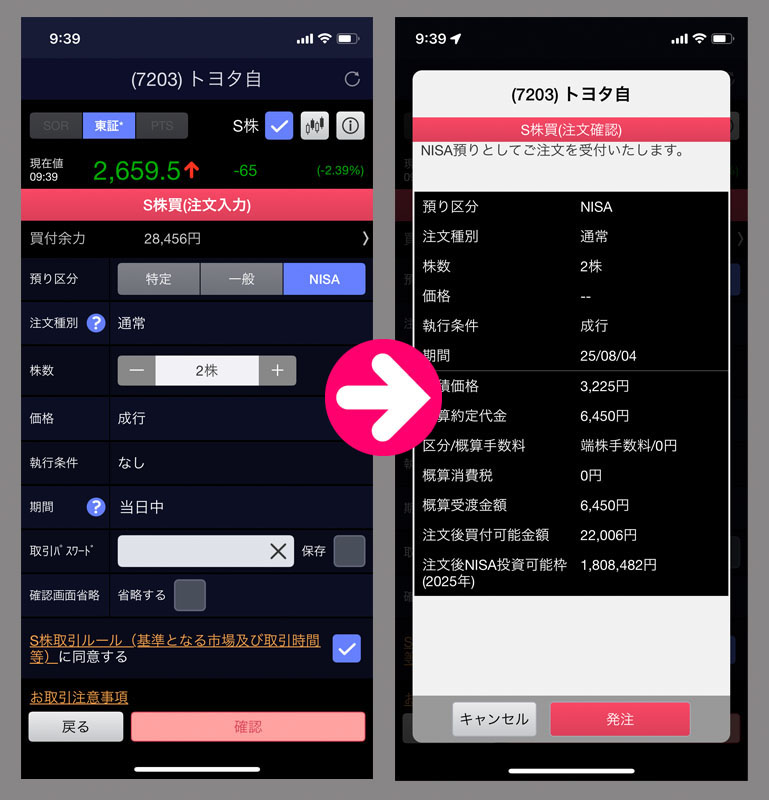 トヨタは2,700を割ったら買い候補になります。今が2,659.5なので2,700にはならんだろうと思って2株にしました。