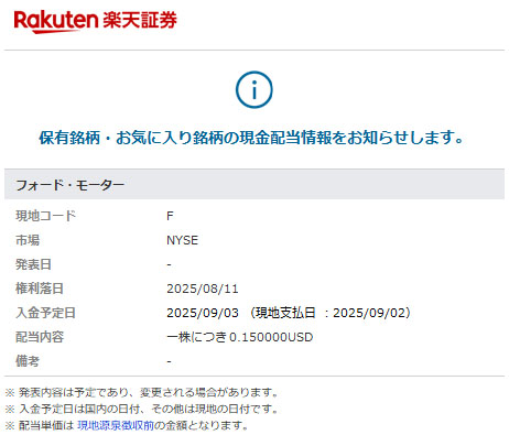 フォード・モーター(F)の9月分配当の案内メールが楽天証券から届きました。