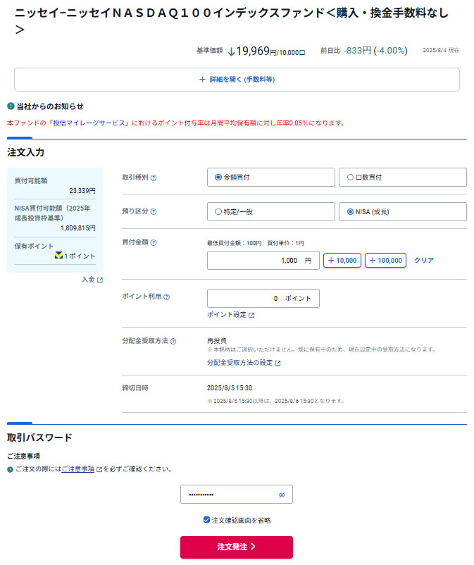 先日、申請した「クラシルリワード」コイン分のドットマネーが現金化しましたので「ニッセイNASDAQ100インデックスファンド」へ1,000円分追加します。