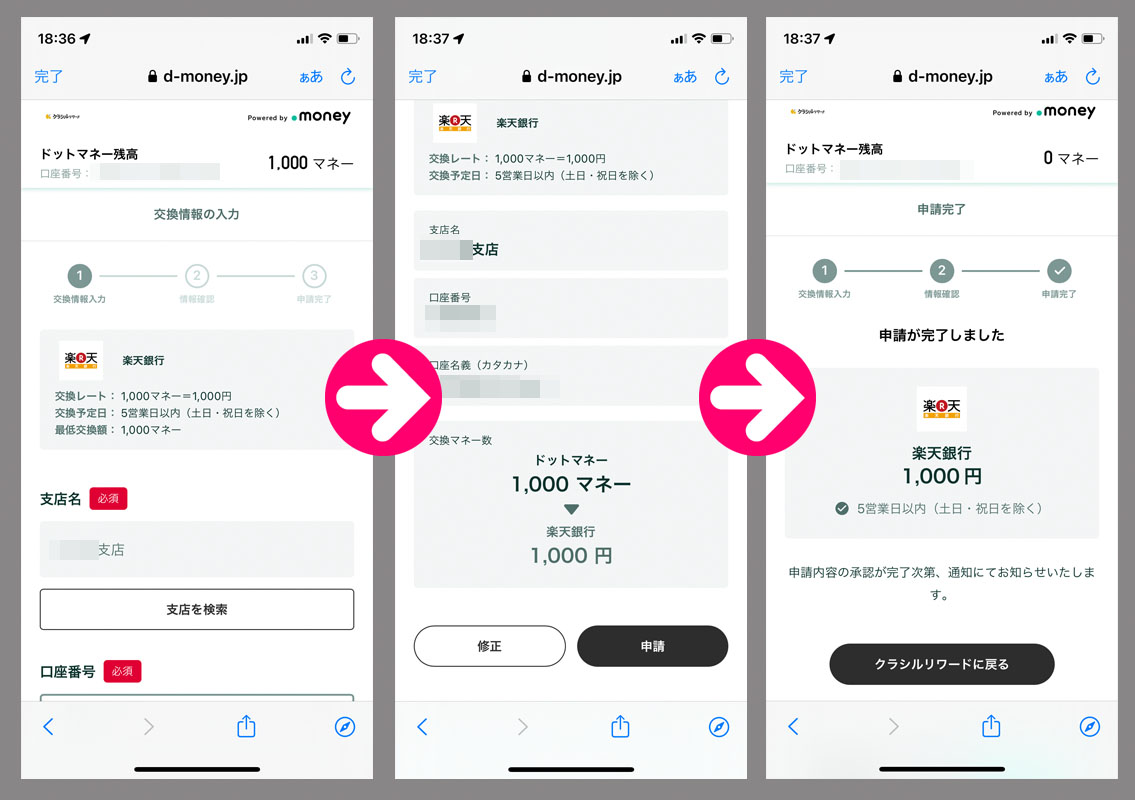 クラシルリワードのコインが貯まったのでドットマネーに変換からの換金手続き|2025.8.13 「食べチャレ」のコインが追加され110,000コインを超えたのでドットマネーに変換からの換金手続きをしました。 「クラシルリワード」から直での銀振は今回で2回目。 普通に「銀行振り込み」を選択して進むだけなので特に問題はありません。私は楽天銀行口座になります。 手続き完了! 今日が水曜日なので早ければ金曜日の未明に入金が確認できるかも?